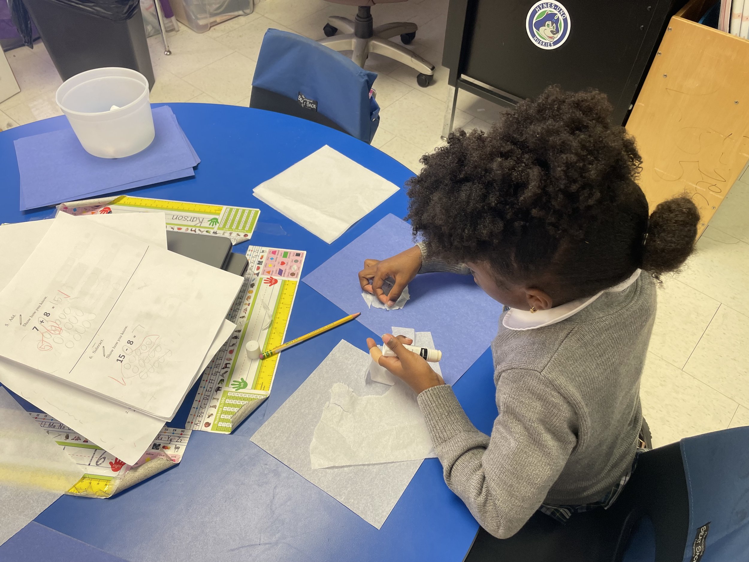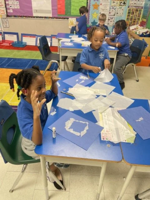 As part of their science curriculum, Ms. Harris’s students are learning to observe the sky. Their class took an exploratory walk to examine different kinds of clouds and weather phenomena. Together, we read “Little Cloud”, by Eric Carle, and brainstormed some of the different clouds we’ve seen. These included clouds shaped like people, buildings, and animals! Students practiced their skills tearing and manipulating tissue paper, and then glued these small pieces in the shape of a creature or object of their choosing. Students created collage clouds in the shape of dinosaurs, cats, foxes, gorillas, unicorns, and even a couple of self portraits. Ms. Harris’s class demonstrated their observational abilities as young scientists and artists, while also practicing their skills tearing and gluing to create unique collages.