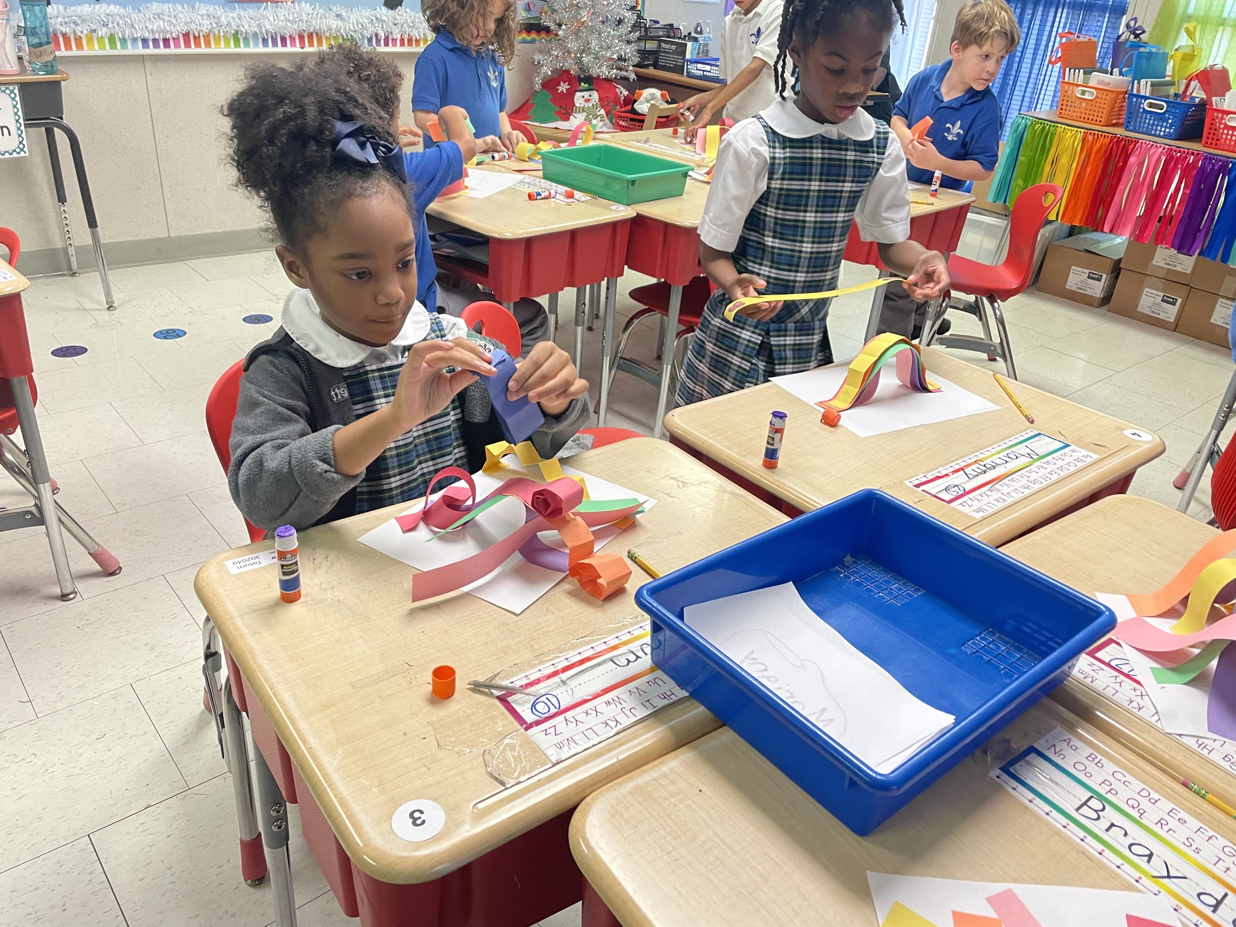 We then explored some of the basic elements that we would be learning about using visual arts for integration: specifically line, shape, and color. I introduced the concept of 3-D, or visual art that takes up space like a sculpture, instead of being flat on a paper. We then discussed the ways that a flat piece of paper can become 3 dimensional, if it is folded! Using strips of construction paper and glue, I demonstrated the steps for creating different kinds of 3-D lines by folding and gluing them. These lines might be curly, bendy, zig zaggy — they can also create shapes like circles, triangles, and squares, that all pop off the paper.