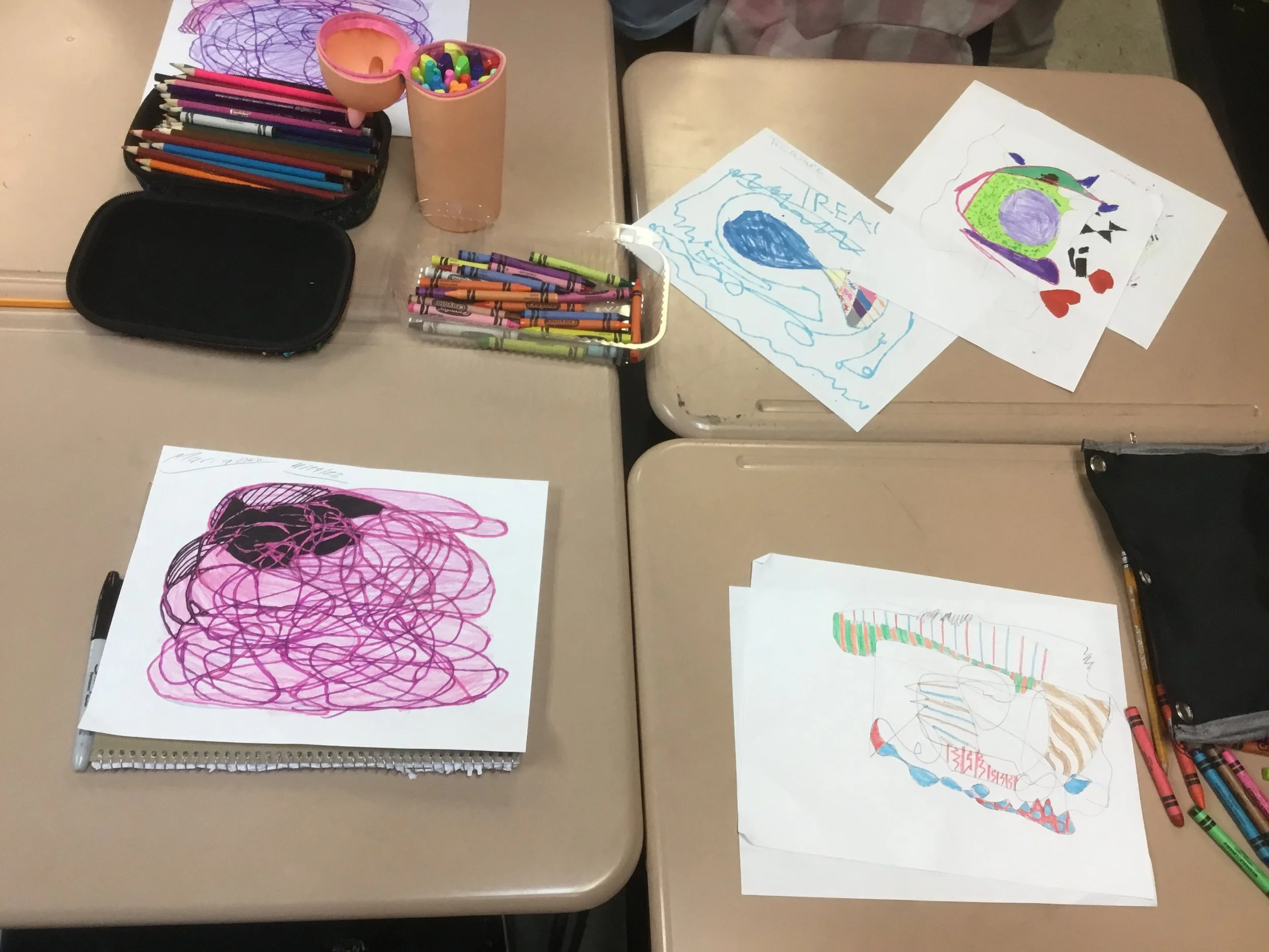 Ms. Hatcher's 4th-grade science students have been working to integrate landforms into the creation of contour line drawings. Before that, though, students used lines to make improvisational drawings. Rather than begin to draw with an outcome in mind, students moved their hands across the page in response to music. After drawing to two songs, students selected their favorite to color; they filled in shapes solidly or with various patterns and hues.