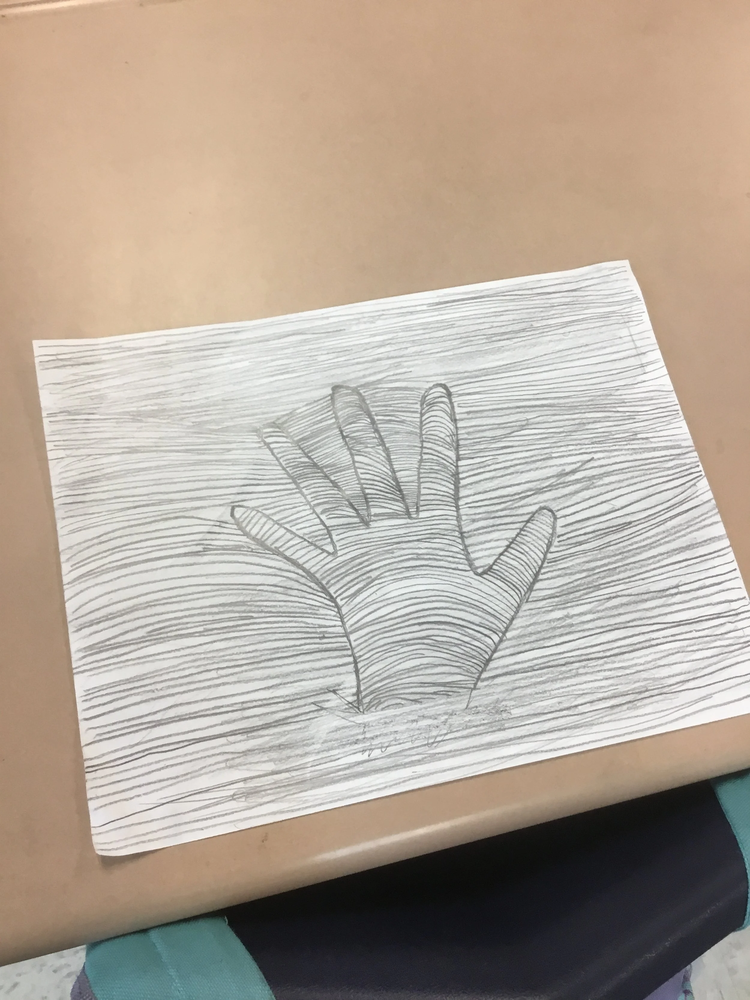 In contrast to the improvisational approach of our first lesson, our next exercise had a predetermined outcome. Combining science and visual art, students traced the outlines of their hands and wrists. They then added lines both within and without the central (and, being October, somewhat spooky) shape. The resulting contour line drawings resemble topographical maps. Once again, in response to a challenge — here of representing our 3D world on 2D paper — art comes to the rescue!